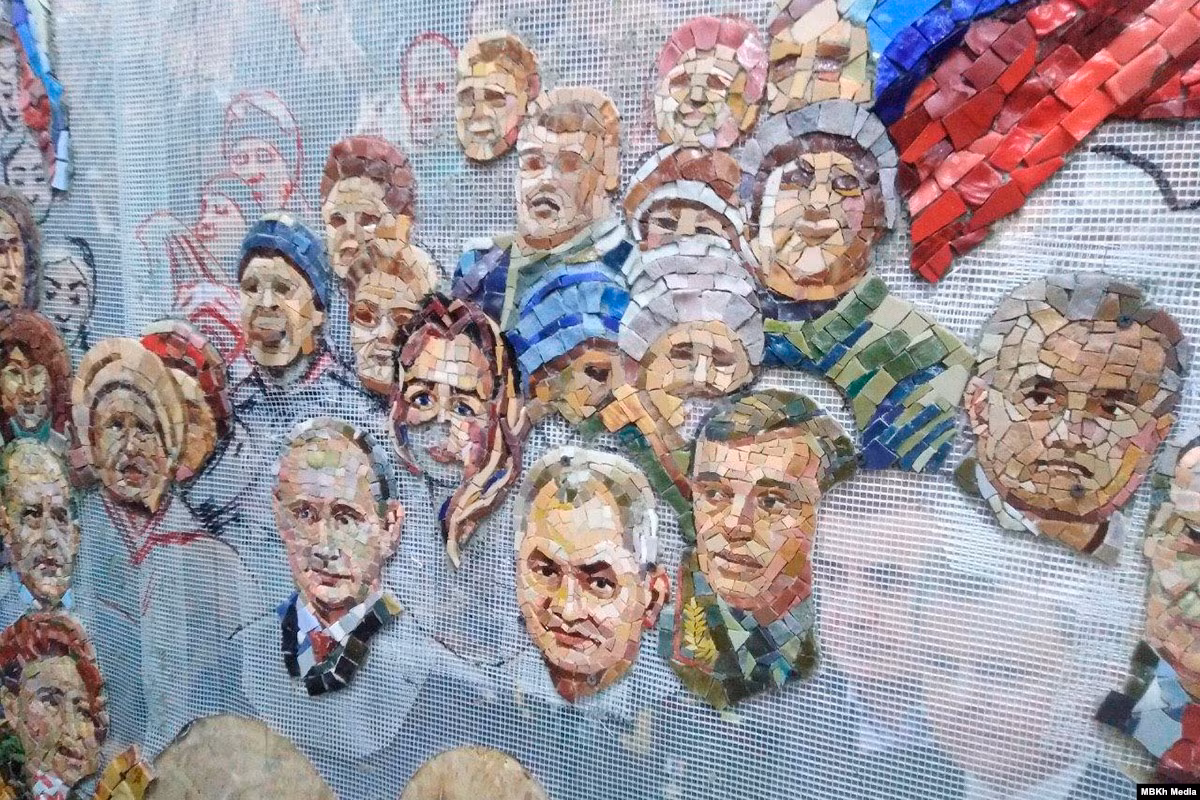 На прошлой неделе "МБХ медиа" опубликовало фотографии незаконченных мозаик, которыми будут украшены стены главного храма Вооруженных сил России. На одном из фото видны изображения президента России Владимира Путина, министра обороны Сергея Шойгу, главы Совета Федерации Валентины Матвиенко, председателя Госдумы Вячеслава Володина, секретаря Совета безопасности Николая Патрушева и директора ФСБ Александра Бортникова, а также надпись "Крым наш". Эта мозаика посвящена аннексии Крыма в 2014 году.