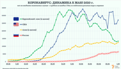 В Соединенных Штатах, где отмечается пока самый высокий суточный прирост инфицированных (кроме США, в первой пятерке стран по этому показателю на сегодня – Бразилия, Россия, Великобритания и Перу), еще в начале апреля произошло первое его заметное сокращение – примерно на 10 дней позже, чем это же было отмечено по странам Европейского союза в целом. Однако если в Европе с тех пор этот прирост снизился в 2,5 раза, то в США – на 20–25%:
