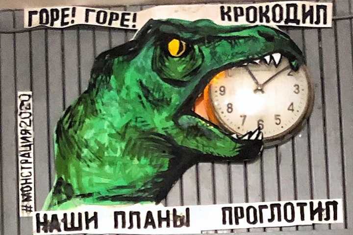 «#монстрация2020 приобретает характер стрит-арта. Рептилоид глотает старые часы в питерской парадной, по мотивам стихотворения К. И. Чуковского. Бумага, гуашь, интегрированная в плакат подсветка», — пишет автор.