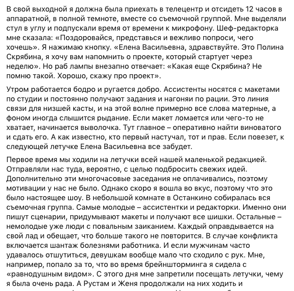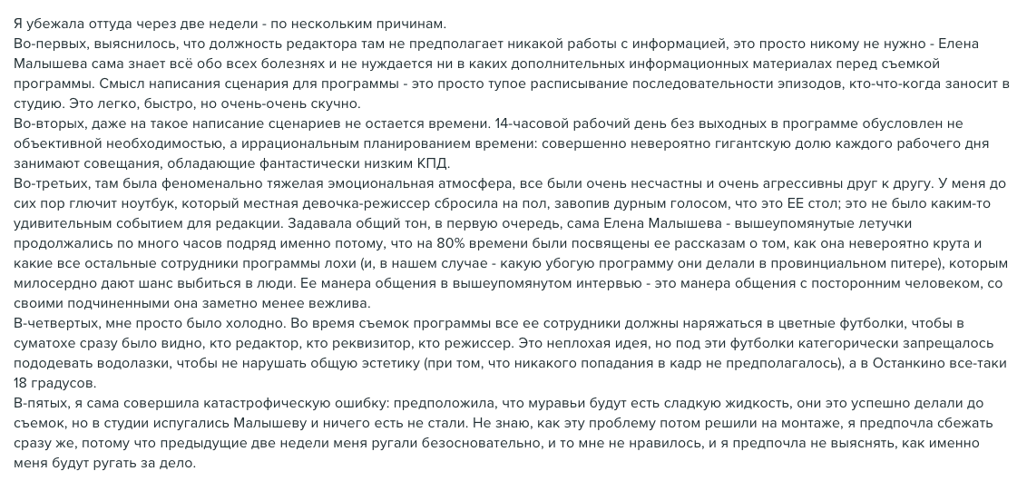 О том, что с Малышевой невозможно работать, писала еще в 2013 году научная журналистка Ася Казанцева. Она тоже рассказывала об абсурдных требованиях руководства программ, из-за которых не смогла проработать там дольше двух недель.