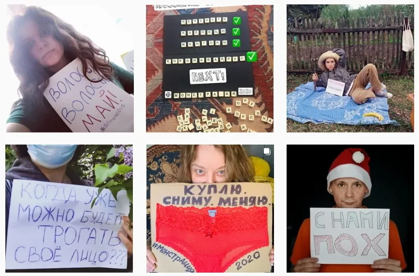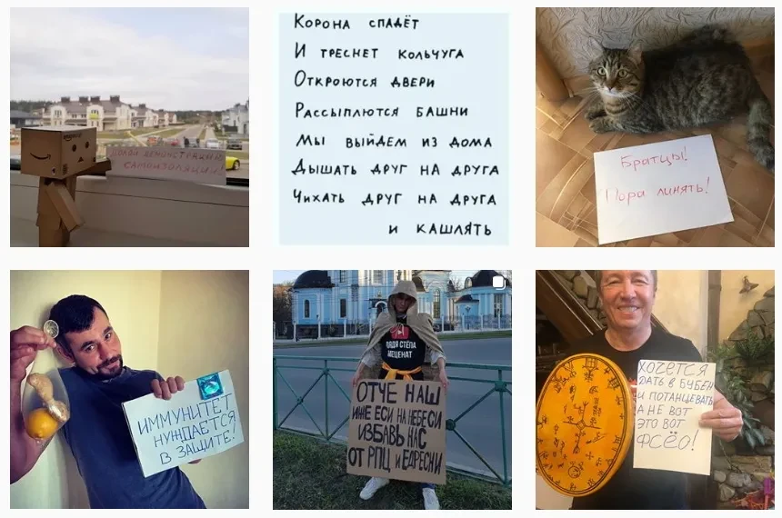 Большинство фото — квартирные и балконные. Кот с плакатом «Мир, труд, мяу!». Парень в пиджаке с аккуратной прической, стоящий на балконе с плакатом: «Зато я без штанов». Много масок и плакатов про маски: «Ношу маску, потому что я ниндзя!». То есть не потому что боюсь, а потому что крутой. Как мы помним, в каждой шутке есть доля шутки.