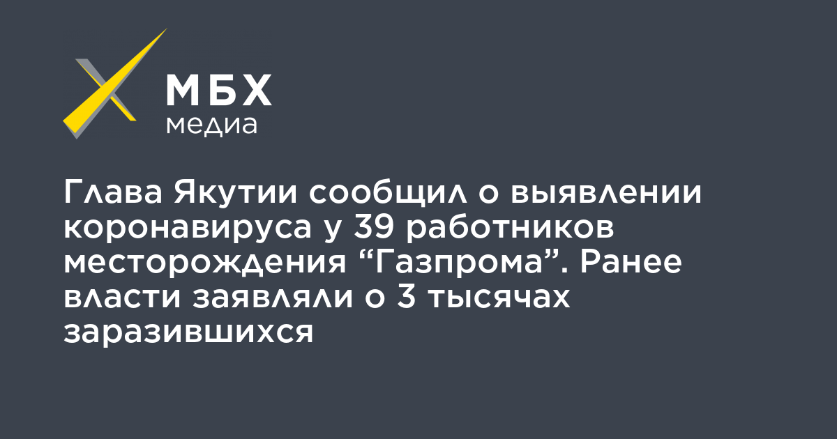 Глава Якутии сообщил о выявлении коронавируса у 39 работников месторождения «Газпрома». Ранее власти заявляли о 3 тысячах заразившихся