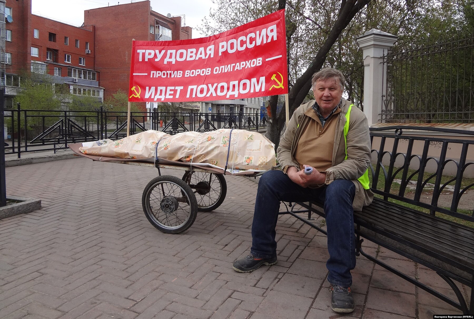 Александр Алексеенко живёт в городе Фурманов Ивановской области. Он начал свой путь 16 марта от границы Иркутской области и Республики Бурятия, с того самого места, где задержали шамана Габышева. Идет пешком, по 30 километров в день. Сначала шел с рюкзаком, потом в бурятском поселке Выдрино местные жители смастерили ему тележку. В неё он сложил сменную одежду, продукты и спальный мешок. На тележку Алексеенко установил баннер с надписью "Трудовая Россия – против воров олигархов – идет походом".