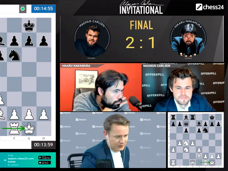 Чемпион мира по шахматам норвежец Магнус Карлсен одержал победу над американцем Хикару Накамурой в финале онлайн-супертурнира Magnus Carlsen Invitational.