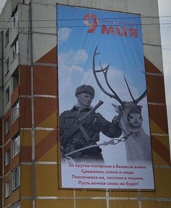 Хотели показать олений батальон, который и у нас здесь формировался, а получилось вот так. Плакат сегодня ночью сняли, заказали новый. Спасибо неравнодушным усинцам, которые заметили [ошибку] и отреагировали. Сейчас вызвал юристов администрации, будем решать, какое наказание понесут виновные сотрудники.