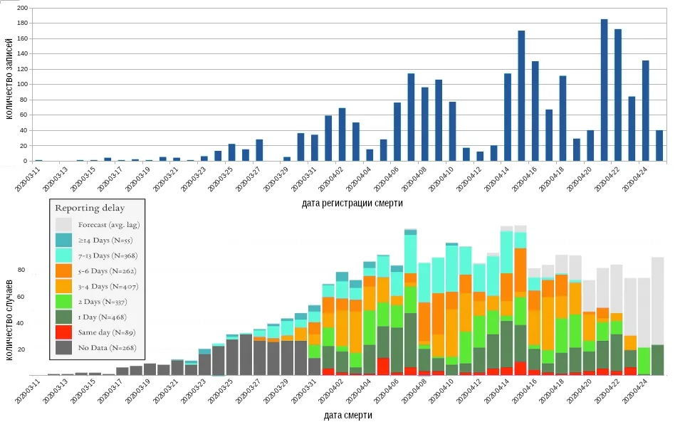В реальности же данные о смерти приходят лишь после подтверждения, большей частью в будние дни, и требуют времени на обработку.