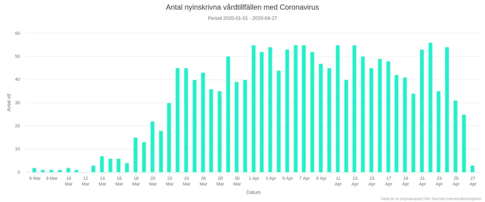 Данные о числе пацентов в отделениях реанимации и интенсивной терапии (ОРИТ), а также связанные с этим показатели можно посмотреть на сайте SIR — Svenska Intensivvårdsregistret [5]. В ОРИТ находится чуть более 500 пациентов с COVID-19 — это число остается стабильным уже достаточно долго [6], в то время как само количество доступных мест в ОРИТ постоянно растет и составляет сейчас более 1100. Доступных — то есть специально оборудованных, со свободным квалифицированным персоналом. Чуть менее 500 из доступных мест заняты сейчас прочими пациентами (рис. 3).