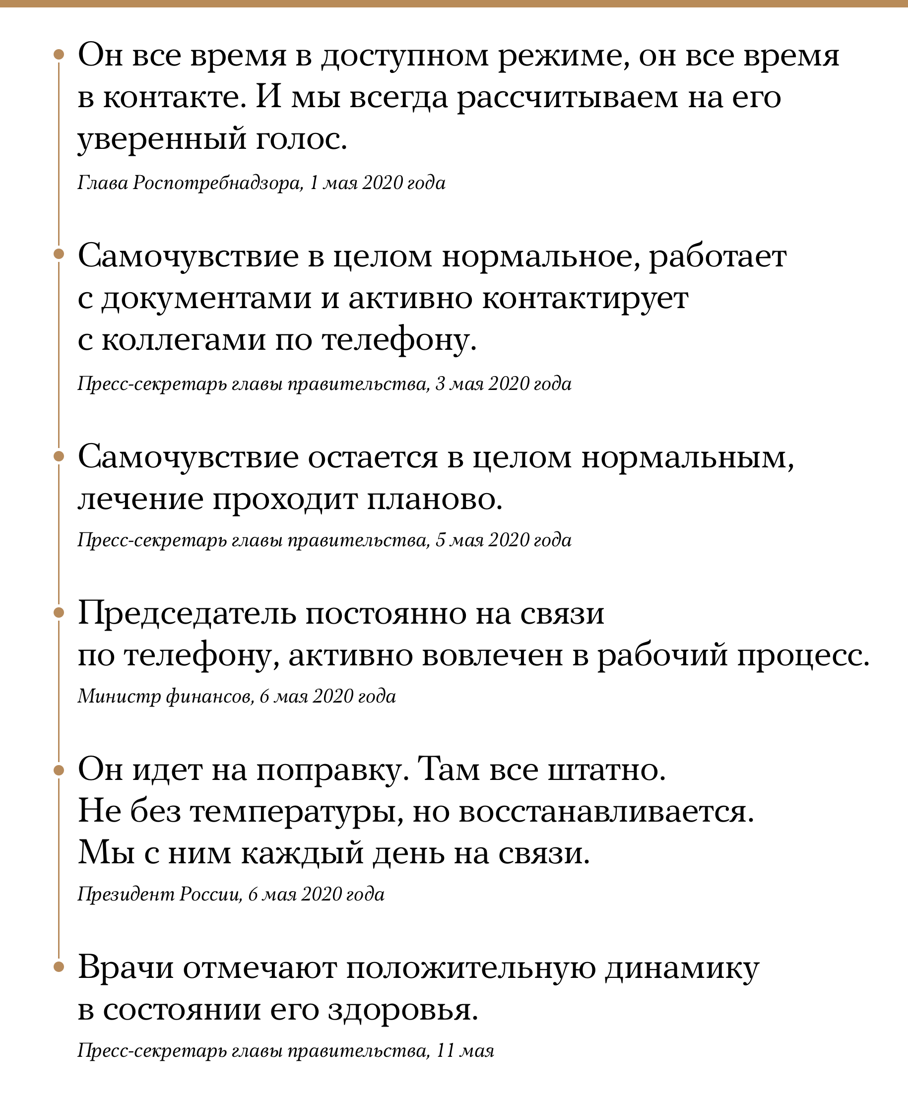 30 апреля стало известно, что у премьер-министра России Михаила Мишустина обнаружили коронавирус. Глава правительства отправился на лечение в стационар, его обязанности стал исполнять первый вице-премьер Андрей Белоусов (два источника «Медузы» высказали мнение, что после выздоровления Мишустин не вернется в премьерское кресло, в Кремле эти предположения назвали «ерундой»). На официальном уровне о здоровье премьер-министра говорят скупо: состояние нормальное, держит связь с членами правительства по телефону. На неофициальном уровне тоже известно немногое. 30 апреля источники «Коммерсанта» рассказали, что у Мишустина высокая температура, редактор «Эха Москвы» Алексей Венедиктов уточнил, что это температура 39°С. 3 мая Baza сообщила, что премьер лечится в закрытом отделении Центральной клинической больницы в Москве, врачи оценивают его состояние как средней тяжести. 6 мая президент России Владимир Путин заявил, что Мишустин идет на поправку.