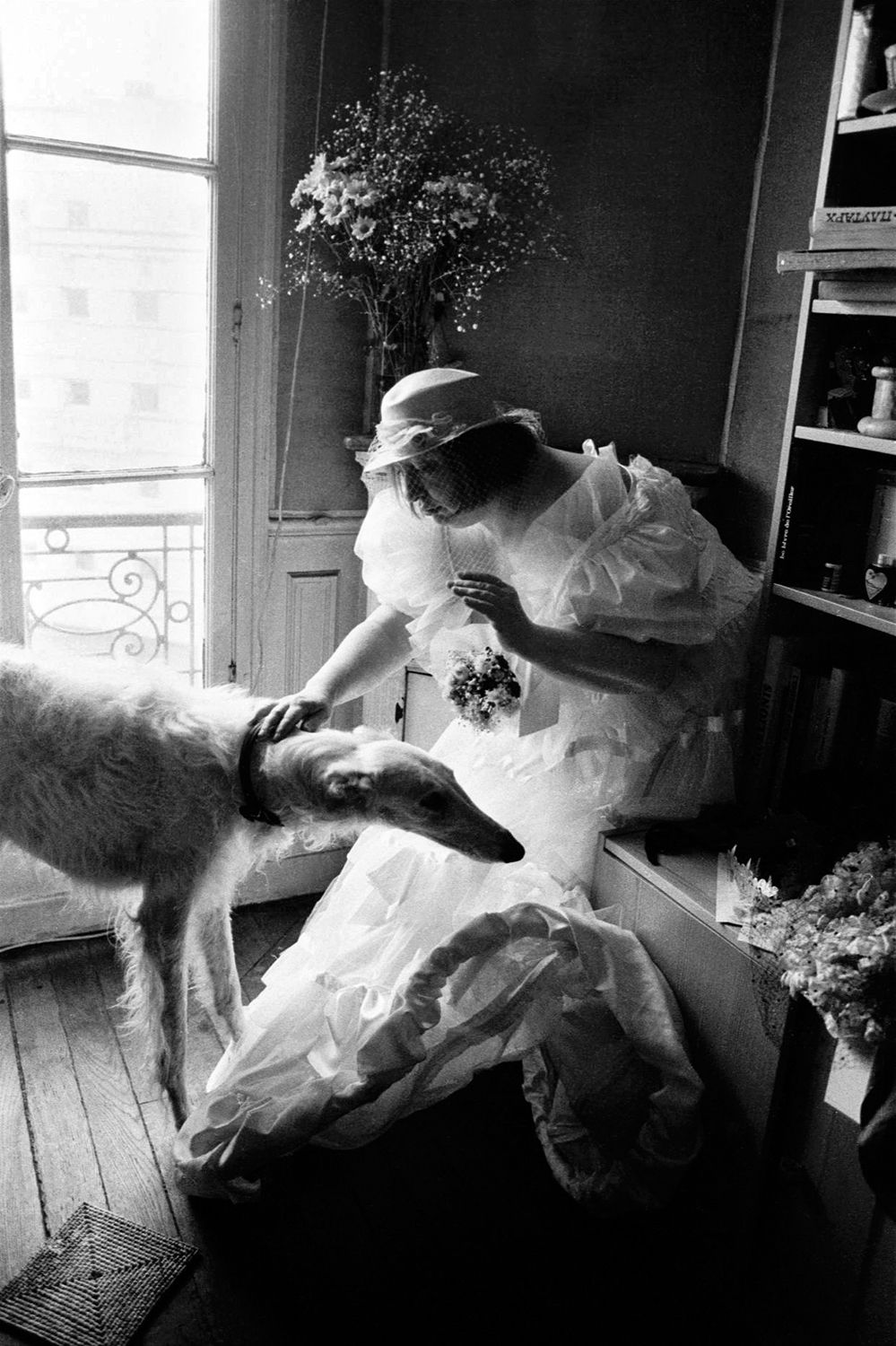 Почему она надела белое платье, я не очень помню. Замуж-то Ольга точно больше выходить не собиралась, думаю, мы просто валяли дурака. Но снимок получился чудный, тонкий, совершенно парижский. В нем все на месте: и завитки на балконной решетке, перекликающиеся с загнутым подолом платья, и движение руки, повторяющее абрис собачьей головы, и коврик, ведущий тайный разговор с большой деревянной катушкой на полке, и мелкие цветы в букете, повторенные в сеточке вуали.