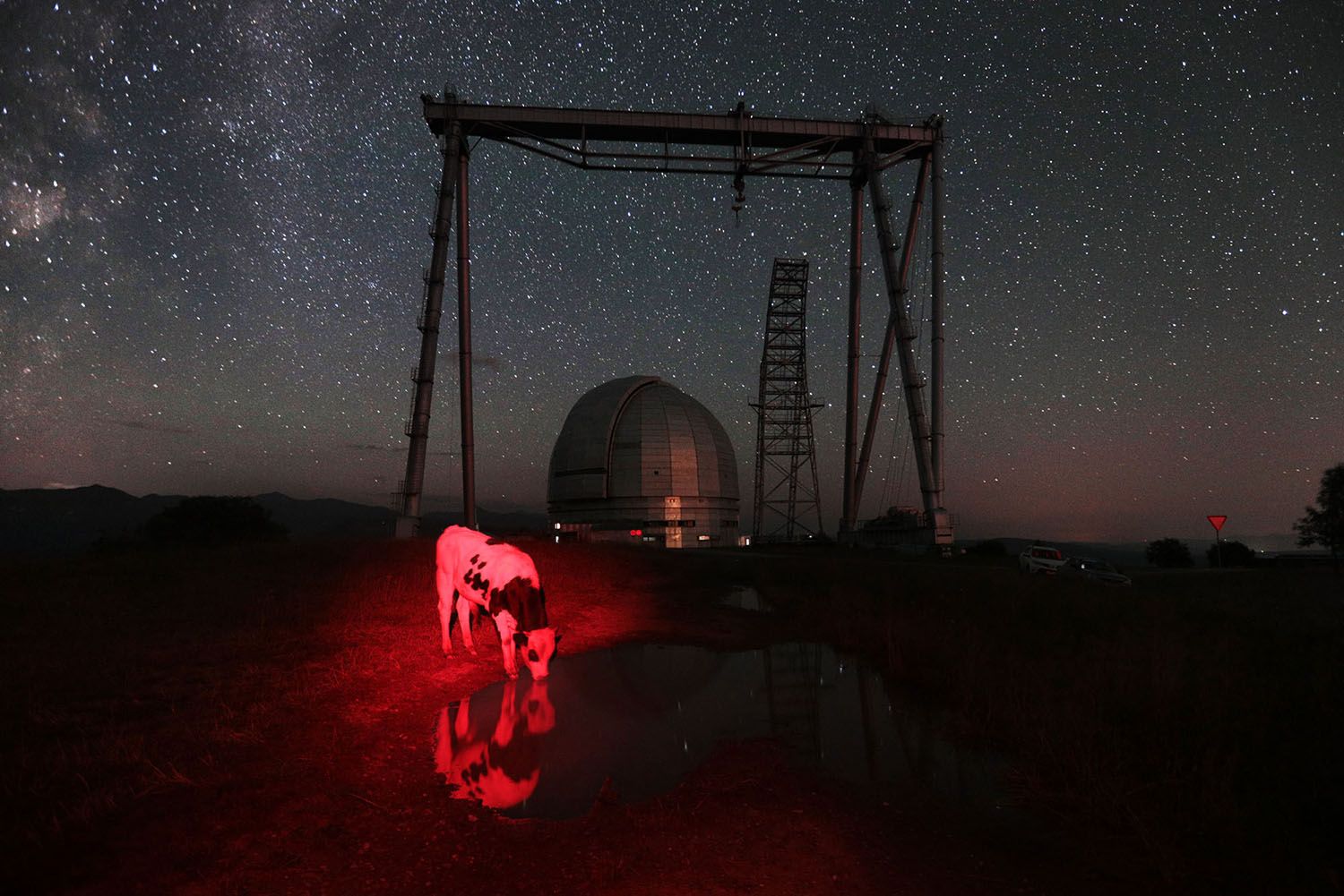 В августе 2017 года я снимала репортаж о жизни астрофизической школы фонда «Траектория». Занятия проходили в Нижнем Архызе, в непосредственной близости от специальной астрофизической обсерватории РАН. Днем я фотографировала гениальных детей, а ночами ездила на гору практиковаться в съемке звездного неба. Как-то ночью я расположилась недалеко от главного здания обсерватории, облюбовав большую лужу в качестве изюминки кадра, поставила камеру на штатив и засекла время часовой экспозиции, чтобы в итоге получились так называемые звездные треки. Я расстелила коврик и, завернувшись в спальник, глазела на чистейшее ночное небо. Незаметно для себя задремала. Но вдруг прямо под ухом услышала громкое чавканье и, раскрыв от ужаса глаза, уставилась в темноту.