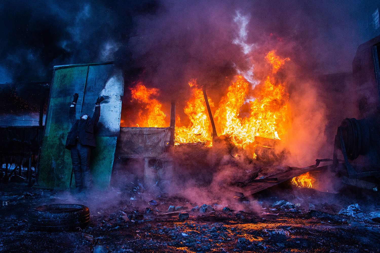 Этот кадр стал обложкой моего альбома «Врозь» про Майдан и Донбасс, который полностью раскуплен. За снимком стоит мистическая история: я нашел его в съемке спустя полгода после событий, которые тогда снимал, — столкновения на Грушевского 19 января 2014 года. Из-за этого и из-за отсутствия соседних фотографий из серии я до сих пор не знаю, что на нем происходит и что делает этот человек.