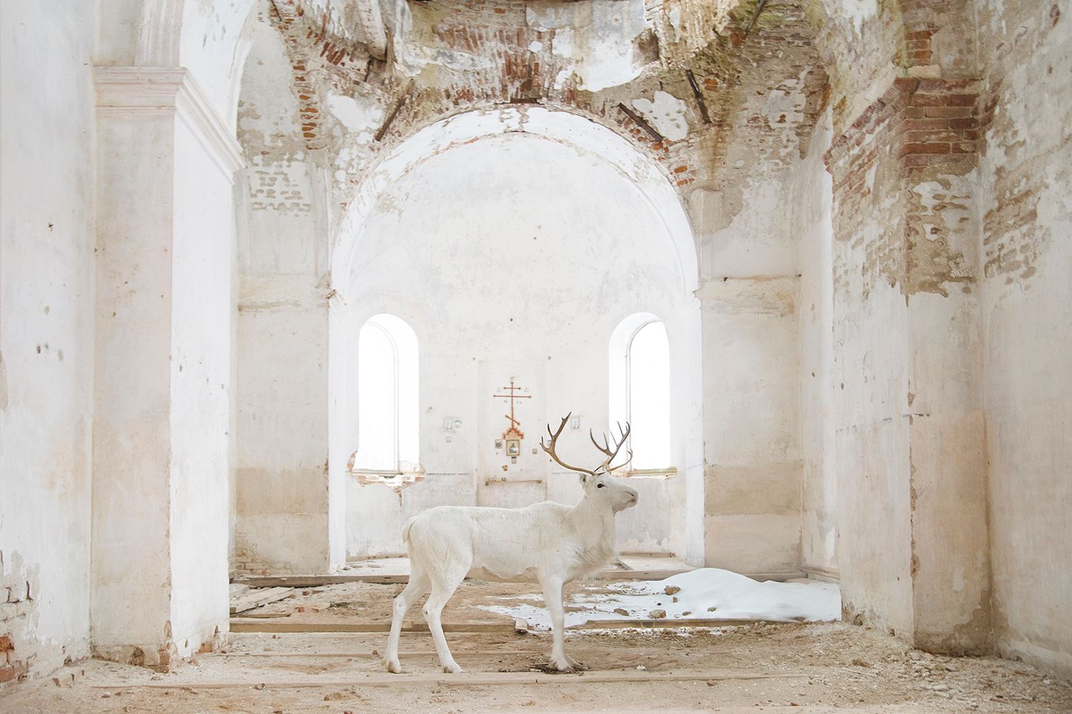 Как и в остальных снимках этой истории, организация заняла больше месяца — в этом случае искали подходящую по архитектуре и локации церковь и героя с ветвистыми рогами. Оленя к месту съемки везли за 600 километров.