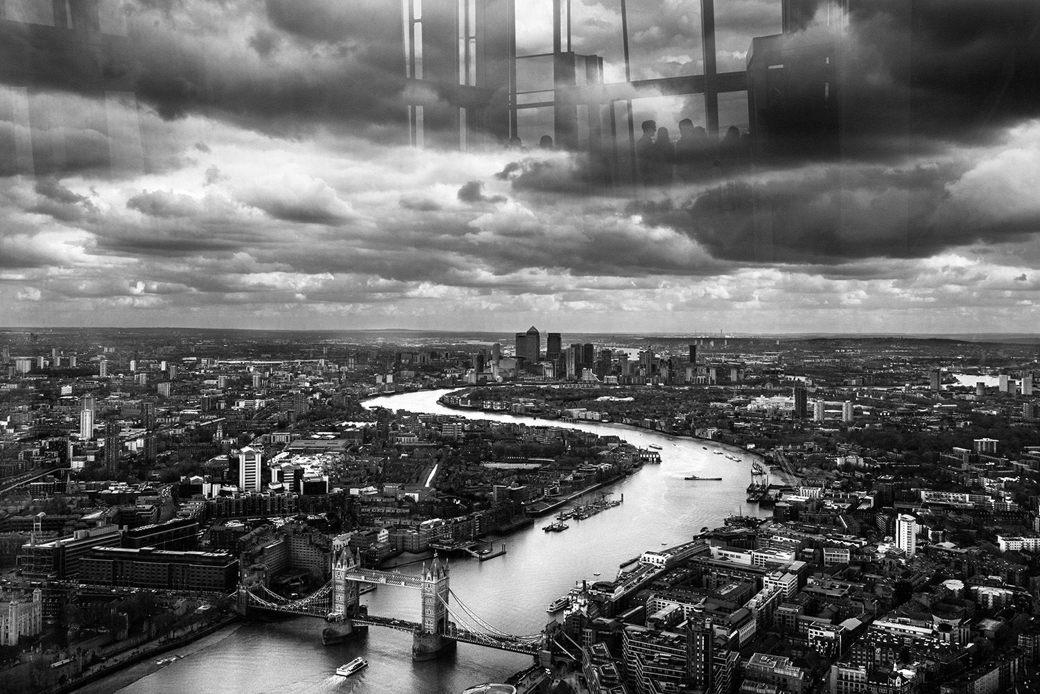 Эта фотография снята с Шарда — одного из самых высоких зданий Европы. Когда я там был, вдруг заметил, что люди, находящиеся на противоположной стороне смотровой площадки, начинают отражаться в стекле. Мне показалось, что это такая метафора небесного офиса и призрачности существования Лондона, который находится на границе между успешным прошлым и совершенно непонятным, достаточно темным будущим.