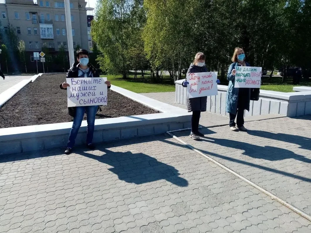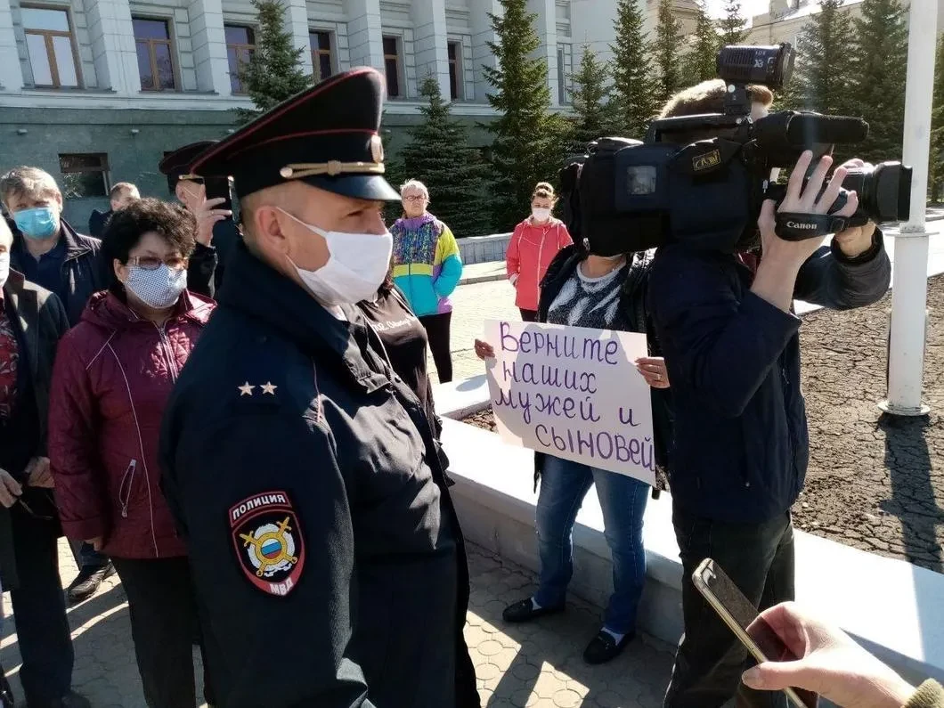 Двадцать омичек 6 мая вышли к зданию облправительства. Все — в масках. Трое из них встали в ряд, развернув плакаты: «Верните наших сыновей и мужей», «Не позволим нарушить права наших родных», «Хочу, чтоб мой папа был дома».