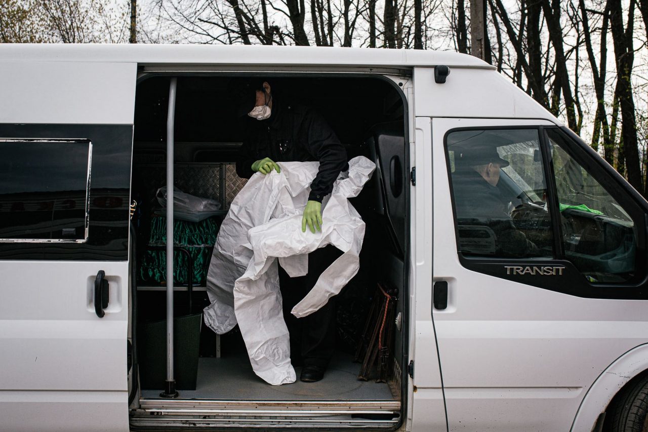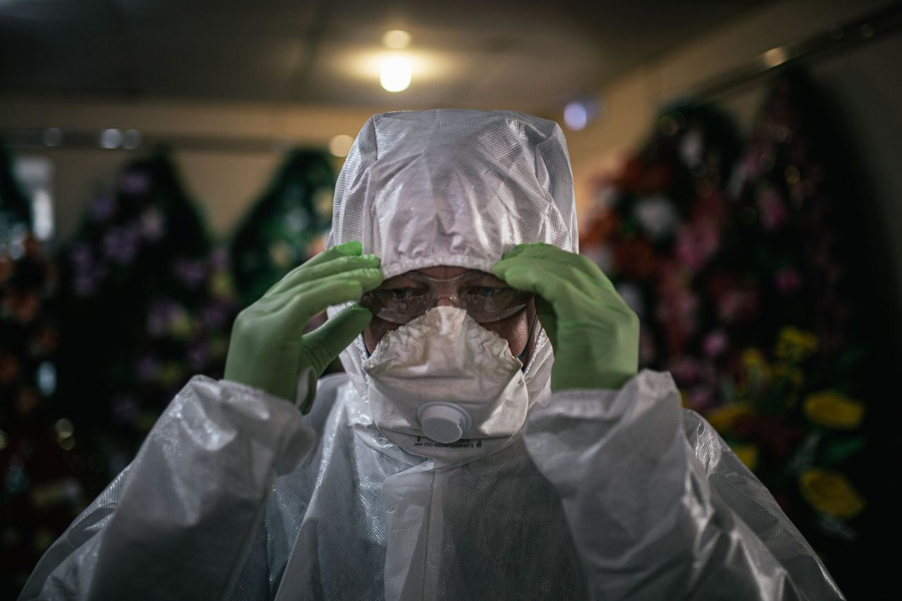Альберт, работник похоронной бригады, поправляет защитный костюмФото: Вадим Брайдов для ТД коронавирус пандемия похоронный бизнес похороны психология