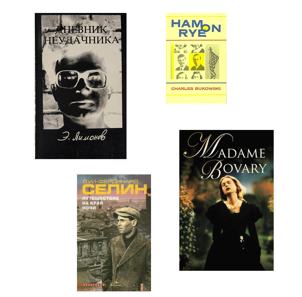 — У меня есть такие четыре книги: «Дневник неудачника» Лимонова, «Мадам Бовари» Флобера, «Путешествие на край ночи» Селина, «Хлеб с ветчиной» Буковски.