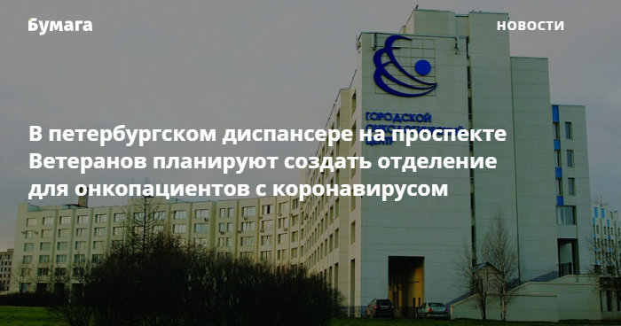 Комитет по здравоохранению Петербурга планирует создать на базе стационара городского онкодиспансера на проспекте Ветеранов, 56 отделение для онкобольных с коронавирусом. Вопрос пока прорабатывается. Об этом пишет ТАСС со ссылкой на пресс-службу комитета.