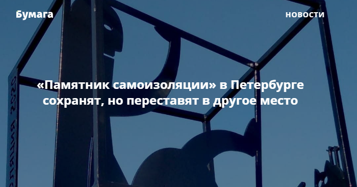 Фотографии «памятника самоизоляции» появились в соцсетях 5 мая. На них было видно, что у входа в Пискаревский парк с Амурской улицы установлена конструкция в виде куба, в котором находятся человек и кот. Ее автор — скульптор, скрывающийся под псевдонимом Бесхвостый пес. Комитет по благоустройству 6 мая демонтировал скульптуру, так как ее установили без согласования: власти сочли, что памятник может быть неустойчивым и опасным для окружающих.