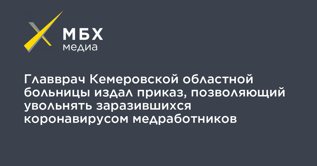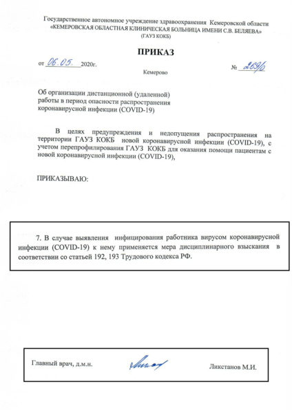 Главврач Кемеровской областной клинической больницы имени Беляева Михаил Ликстанов издал приказ, позволяющий увольнять заразившихся коронавирусом медработников. Документ «МБХ медиа» предоставил подписчик. Информацию также подтвердили в медучреждении.
