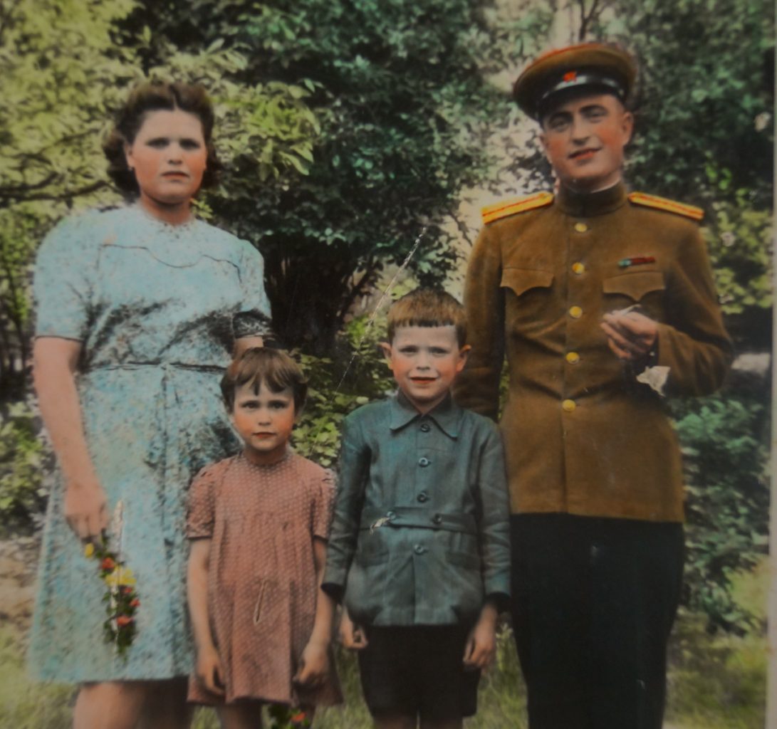 Раскрашенная фотография из Германии. Прадедушка с прабабушкой и детьми (девочка — моя бабушка)Фото: из личного архива Рассказывали, как хозяйка квартиры, где они жили, устроила праздничный ужин в честь приезда из СССР моей прабабушки с детьми. Вспоминали печку в том доме, которая была газовой, но могла работать и на дровах, и на угле. Прадедушка и прабабушка, родившиеся в деревне на Алтае, такого уровня комфорта никогда не видели. Папе кажется, то послевоенное время было лучшим периодом в их жизни.
