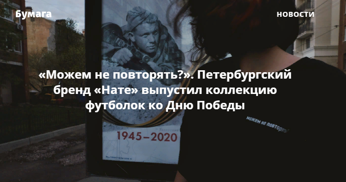 Петербургский бренд «Нате» выпустил новую тематическую линию футболок, посвященную Дню Победы. Она называется «Можем не повторять?», сообщили «Бумаге» представители бренда.