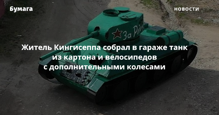 Сначала Владислав сделал уменьшенный прототип, затем увеличил параметры, собрал каркас из деревянных реек и обшил его картоном. Мужчина также использовал два велосипеда с дополнительными колесами, чтобы танк мог ездить. Болдырев покрасил картонный Т-34 в зеленый цвет и написал на корпусе «За Родину».