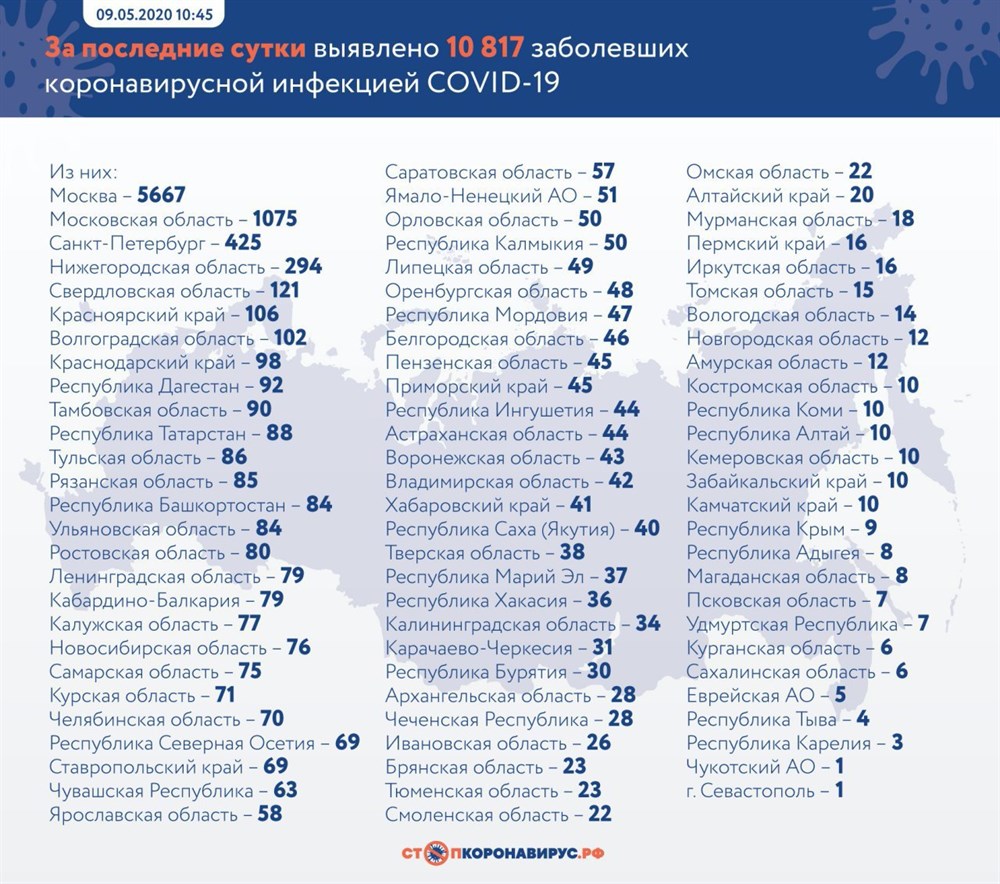 За последние сутки в России выявлено больше 10 тысяч заболевших новой коронавирусной инфекцией. Всего в стране выявлено почти 199 тысяч заболевших, а число выздоровевших пациентов увеличилось до 31 916 человек.