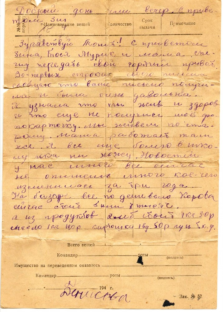 С военных лет у меня сохранилось письмо к старшему брату Алексею (мы его Ленькой звали): я помню, писала на крыльце, весной, сидя на табурете, (далее орфография школьницы Зины сохранена — ред): «Здравствуй, Леонид, с приветом Зина, Тосик, Мурик и мама. Спешу передать свой горячий привет. Во-первых строках своего письма сообщаю что ваше письмо получила и была очень довольна. Я узнала что ты жив и здоров. И что еще не получил мою фотокарточку. Мы живет по старому. Мама работает там же. Я все еще болею в школу пока не хожу. Новостей у нас много, все сейчас не опишешь. Много кое-чего изменилось за три года. На базаре все по дешевело. Корова сейчас стоит 6 или 7 тысяч. А из продуктов хлеб стоит 1 кг 30 руб., масло 1 кг 180 руб., картошка 1 вед. 50 руб ну и тд Денисова».