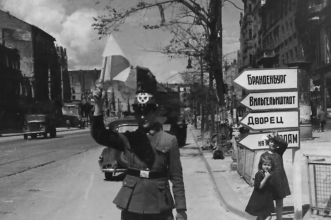 В его объектив попадали маршалы Жуков и Рокоссовский, Константин Симонов и Роман Кармен, первые встречи с американскими союзниками на Эльбе и главнокомандующий британскими оккупационными войсками в Германии сэр Бернард Лоу Монтгомери, берлинские кафе и регулировщики… Он снимал Военный совет 1-го Белорусского фронта перед штурмом Берлина, подписание капитуляции в Карлсхорсте и Декларации о поражении Германии… И еще операторы, передавая друг другу фотоаппараты, делали, как мы бы сейчас сказали, что-то вроде «селфи» — на фоне Рейхстага и Рейхсканцелярии, Бранденбургских ворот и Курфюрстендамм, и за всем этим вставал тревожный Берлин и их победная весна 45-го. Многие берлинские фотографии, где Илья Аронс в кадре, были сделаны его лучшим другом Евгением Халдеем.