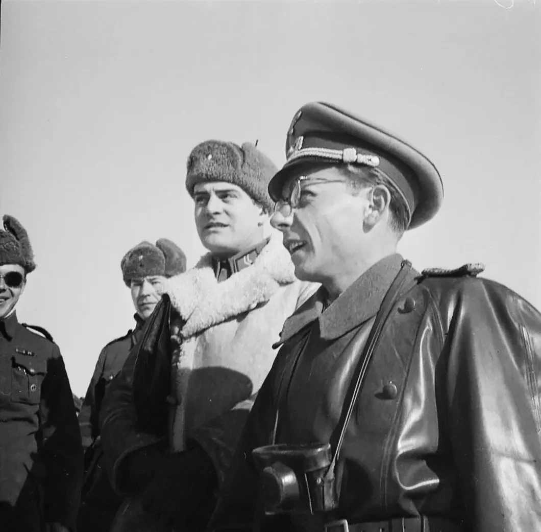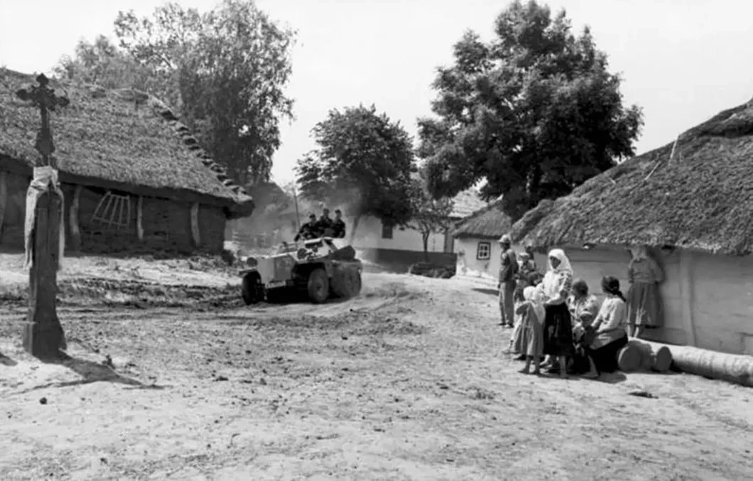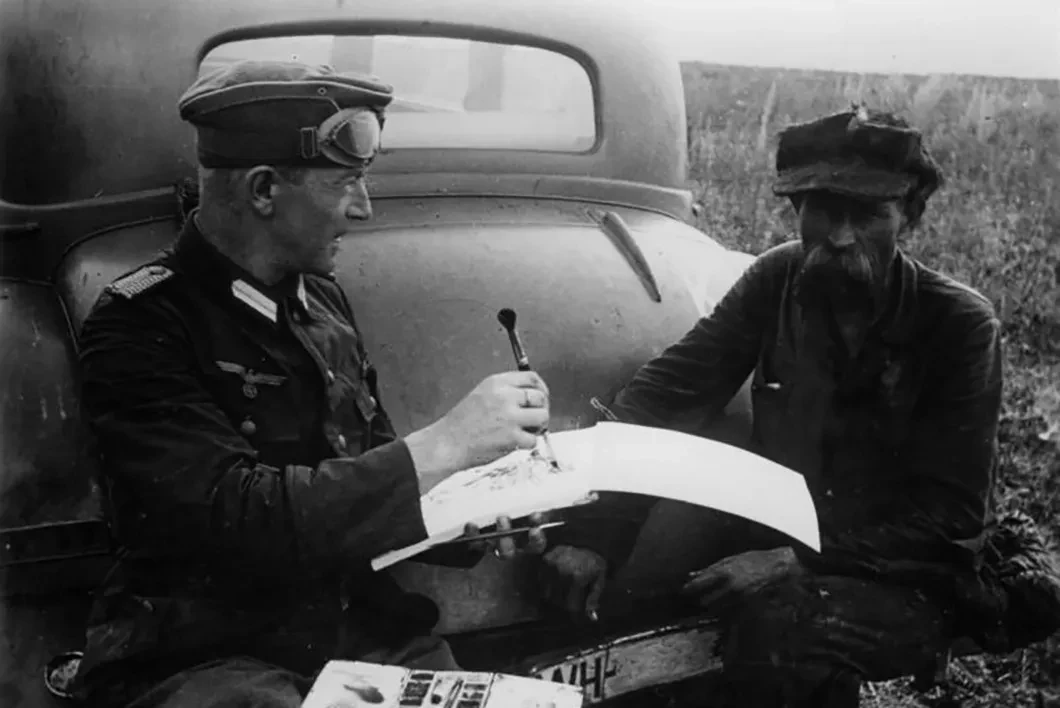 В 1940 году Артур Гримм надел серую форму вермахта — все пять лет войны он был зондерфюрер, что на русский можно перевести как «специалист на военной службе». Он был специалист фотографии, специалист по уловлению жизни в видоискатель, специалист пропаганды, призванный показать немцам и всему миру великие деяния вставшего с колен и начавшего новую жизнь германского народа. Ас репортажа, мастер поймать в кадр мгновения жизни, он увидел низкорослого молодого танкиста с оттопыренными ушами под пилоткой, сидящего на броне и по-детски радующегося письму, полученному из дома; он увидел, как жарким летним днем сидят рядом на распаренной земле, в высокой теплой траве, взятый в плен советский комиссар и немец из полевой полиции, держащий в руках изъятую у пленного военную книжку с красной звездой. На запястье у немца компас. Кажется, они просто присели поговорить; но это допрос, и как же сжат и закрыт в своей позе комиссар с опущенным вниз лицом, с переплетенными ногами в сапогах и с руками, которыми он обхватывает сам себя, словно не хочет дать себе расшириться, разбежаться, растечься, развалиться в том немыслимом, что только что, полчаса назад, случилось с ним.