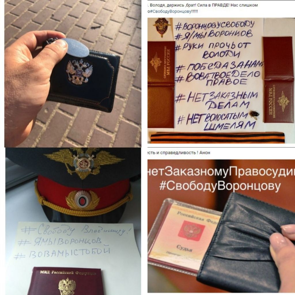 As part of the online flashmob, officers posted photos on social networks with the hashtag #СвободуВоронцову (“Freedom for Vorontsov”), the human rights outlet Mediazona reported. Most of these posts are anonymous; the officers either cover their faces or their photos simply show pieces of their uniforms or badges. Several officers are openly supporting Vorontsov, however, and a handful spoke to Mediazona.