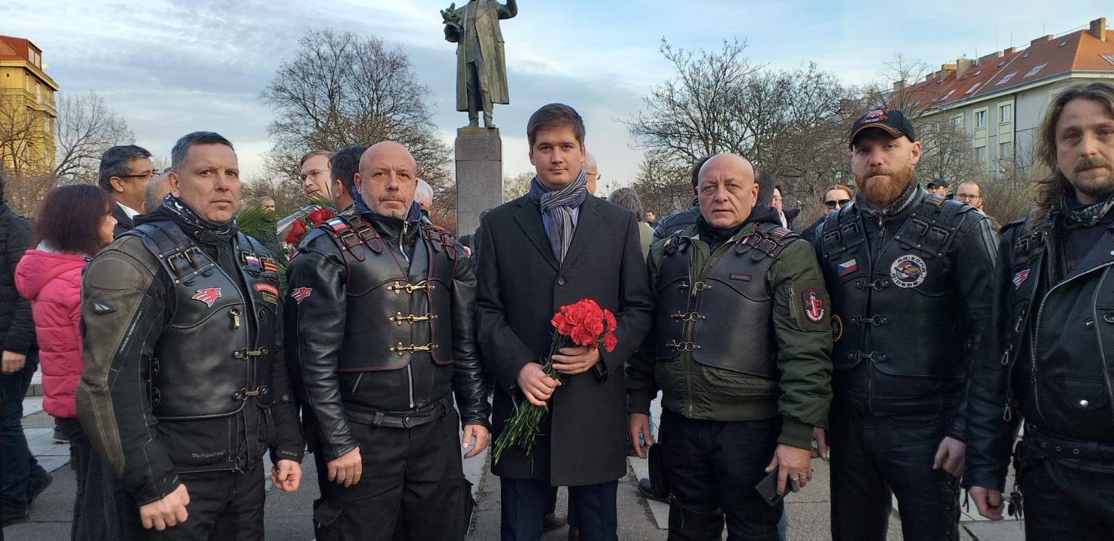 Андрей Кончаков и байкеры из клуба «Ночные волки». На заднем плане — памятник маршалу Коневу до сноса. Фото: личная страница в Facebook