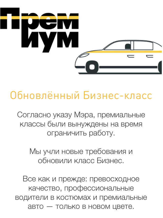 Спорить с решением мэрии массовые сервисы «Яндекс.Такси», Uber и Gett не стали: они просто сделали премиум-опции недоступными в своих приложениях; впрочем, позже Gett вернул «обновленный бизнес-класс». «Чтобы обеспечить наших клиентов машинами повышенного класса в период повышенной готовности, мы выполняем все необходимые требования, предписываемые нормативными документами правительства Москвы», — сообщили «Коммерсанту» в пресс-службе еще одного агрегатора «Ситимобил», не уточнив, когда возобновятся заказы по тарифу «Бизнес».