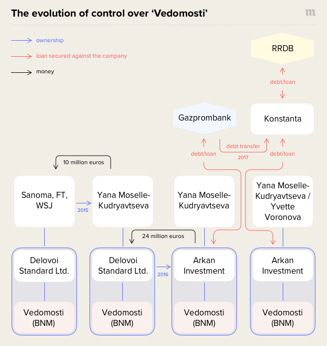 A source with knowledge of Vedomosti’s current sale told Meduza that Kudryavtsev decided to sell the newspaper under pressure from Arkan Investment’s creditors, arranging a complex transaction to get the deal’s participants to pay off and restructure Arkan Investment’s sizable debts. Kudryavtsev declined to discuss the deal’s structure with Meduza.
