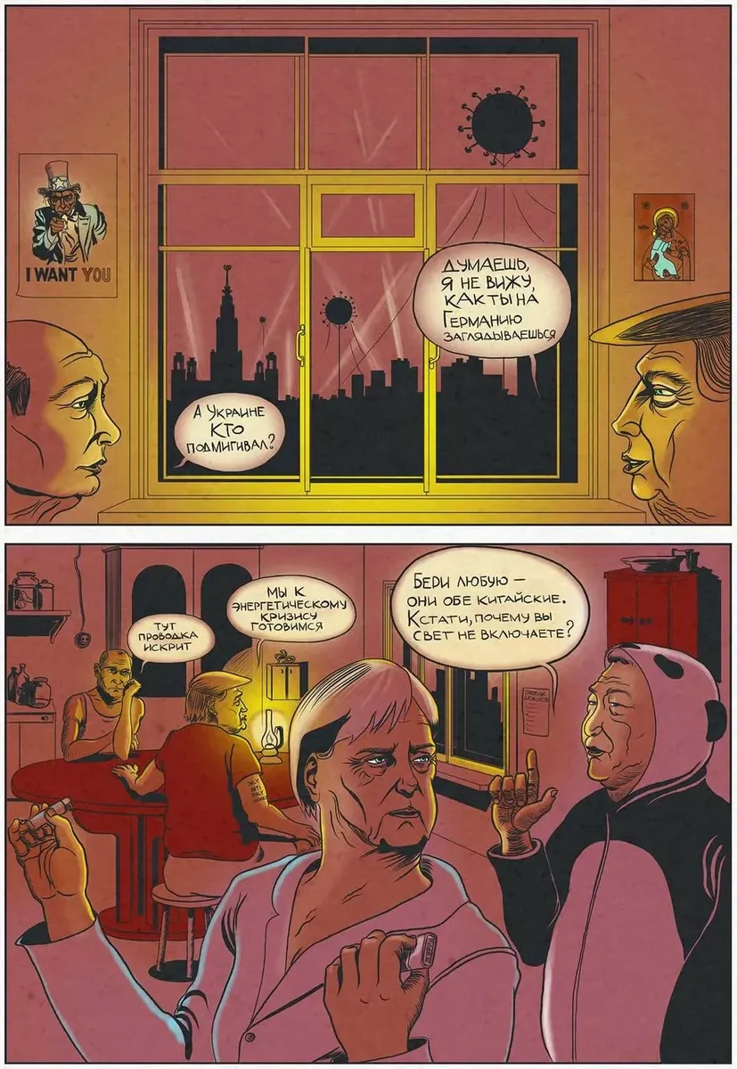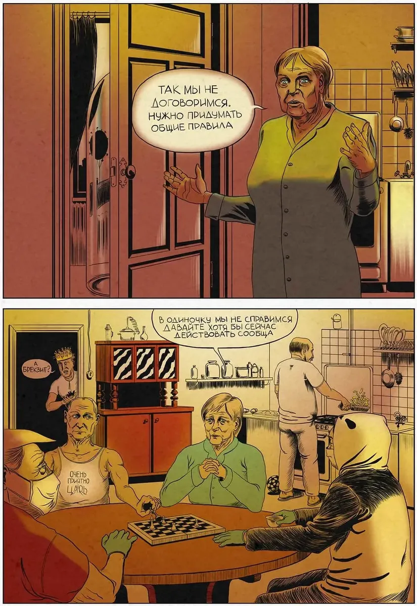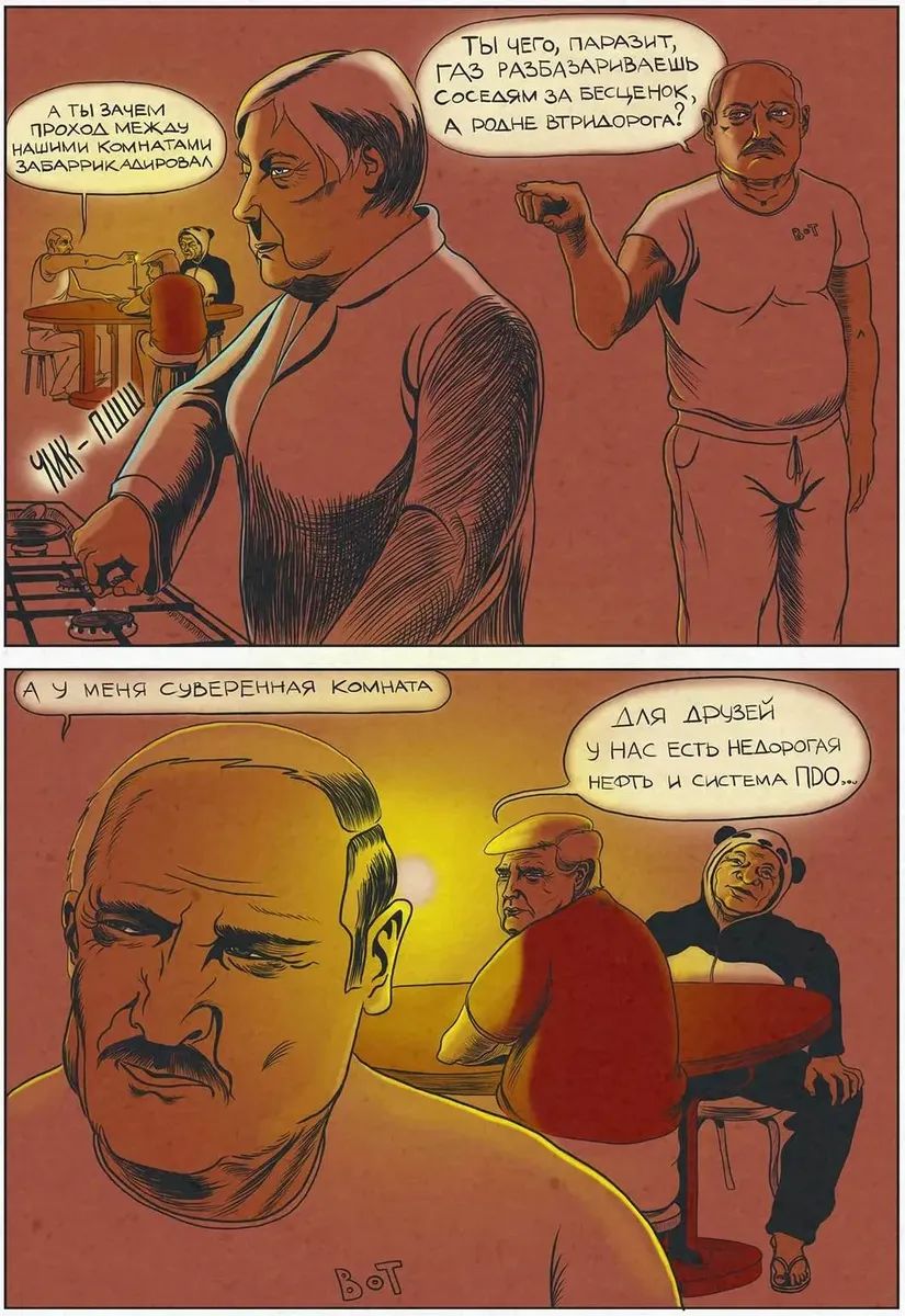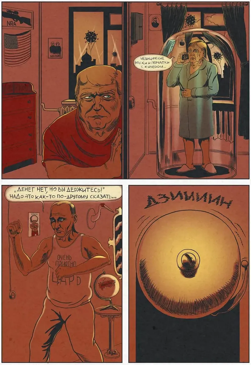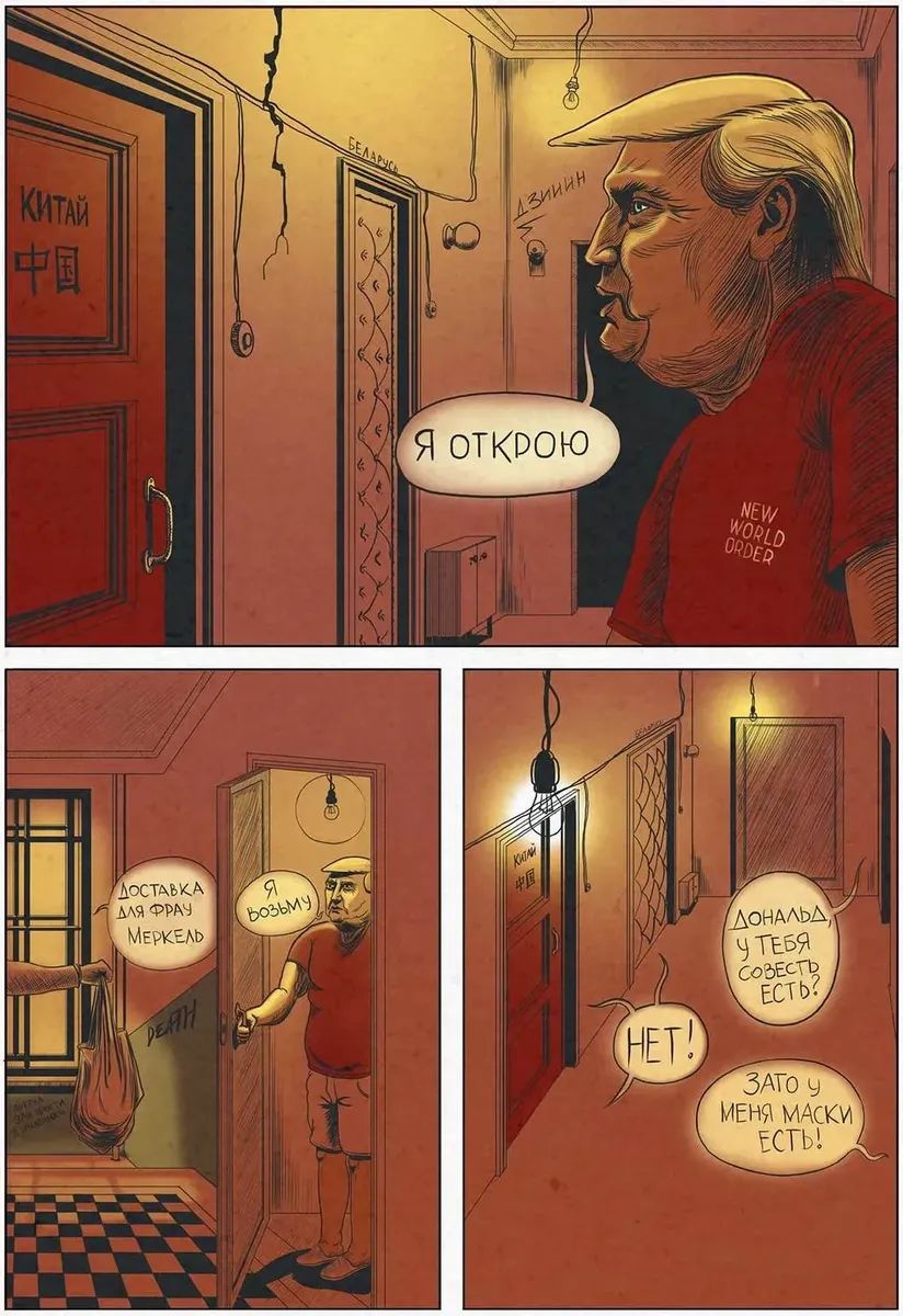 Лидеры России, США, Великобритании, Китая, Германии и Беларуси изолировались в одной квартире. Комикс