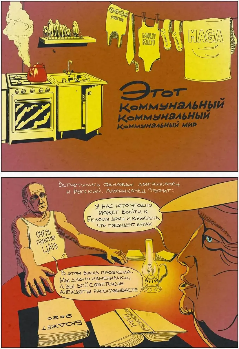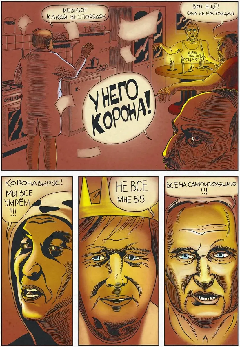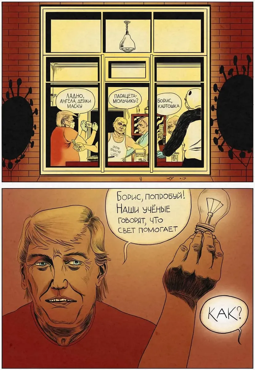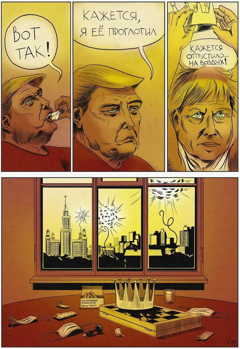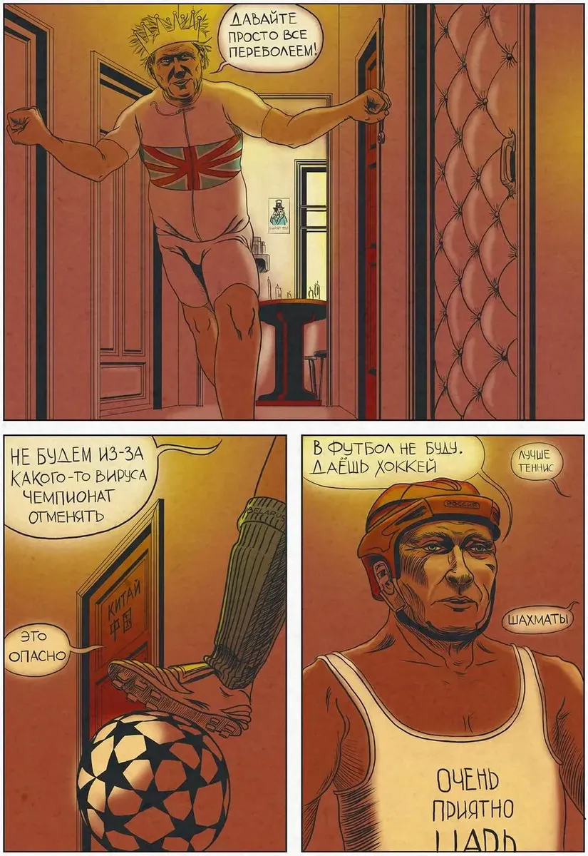 Лидеры России, США, Великобритании, Китая, Германии и Беларуси изолировались в одной квартире. Комикс