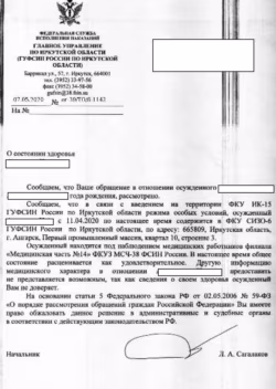 – Он заинтересованное лицо как "пострадавший по делу о дезорганизации". Вообще неизвестно, получала ли медслужба иркутского МСЧ запросы родственников о предоставлении информации по состоянию их здоровья. Ведь именно МСЧ области или начальник больницы, где осужденный получает медпомощь, должны отвечать на подобные запросы. Поскольку это отдельное от ГУФСИН ведомство, которое ему не подчиняется. А так получается, что Сагалаков как потерпевший заинтересован в ходе расследования. И до сих пор дает ответы родственникам, – рассуждает Глущенко.