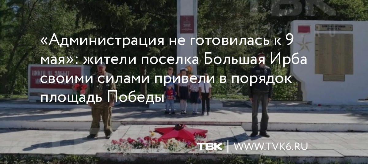 В администрации поселка слова местных жителей опровергли – 8 мая ветеранам вручили цветы и подарки, а труженикам тыла подарили поздравительные открытки.«Администрация поселка Большая Ирба решила вообще никак не готовится к празднику. Площадь Победы 8 мая вечером убирали инициативные жители! Белили, красили звезду, сами подключали Вечный огонь. Только вот не было среди нас ни одного человека из администрации. Они даже не поздравили трех оставшихся в живых ветеранов!, – рассказала местная жительница Юлия.