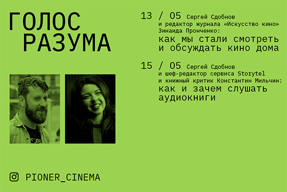 13 и 15 мая в онлайн-программе «Голос разума» кинотеатра «Пионер» состоятся встречи с кинокритиком Зинаидой Пронченко и литературным критиком Константином Мильчиным.