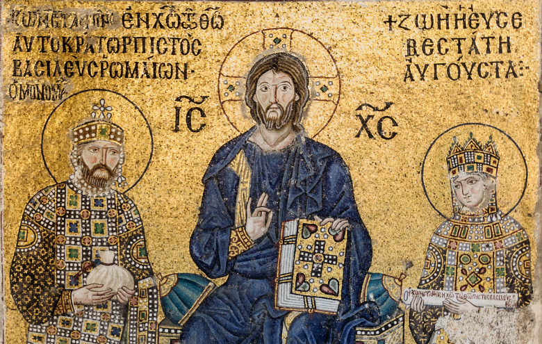 Император Константин Мономах и императрица Зоя перед Христом. Византийская мозаика XI века, собор Святой Софии в Константинополе