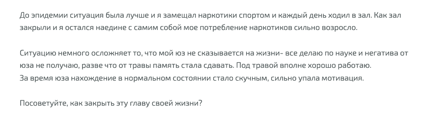 Проблема накропотребителей не только в доступности наркотиков, но и в том, что они остались без поддержки близких и организаций, которые обычно им помогают. Те, кто пытаются «завязать», лишившись возможности встречаться с друзьями и группами поддержки, чаще срываются.