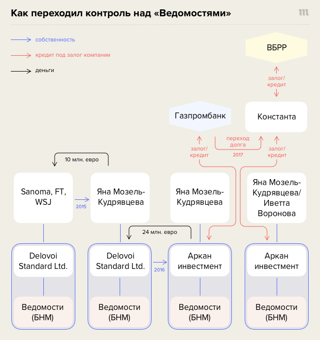 Но ведь большую часть этого кредита (1,74 миллиарда рублей из 2,6 миллиарда рублей) «Аркан» сразу потратил на выкуп «Ведомостей» у кипрского офшора Кудрявцева — это видно по документам, имеющимся у «Медузы». А 740 миллионов рублей кредитных средств (примерно 10 миллионов евро) в том же 2016 году были возвращены банку — это видно в отчете «Аркана». Возможно, это и было финансирование для не сложившейся покупки Premium Publishing. Но это не отменяет использование бóльшей части этого кредита на сделку с «Ведомостями».