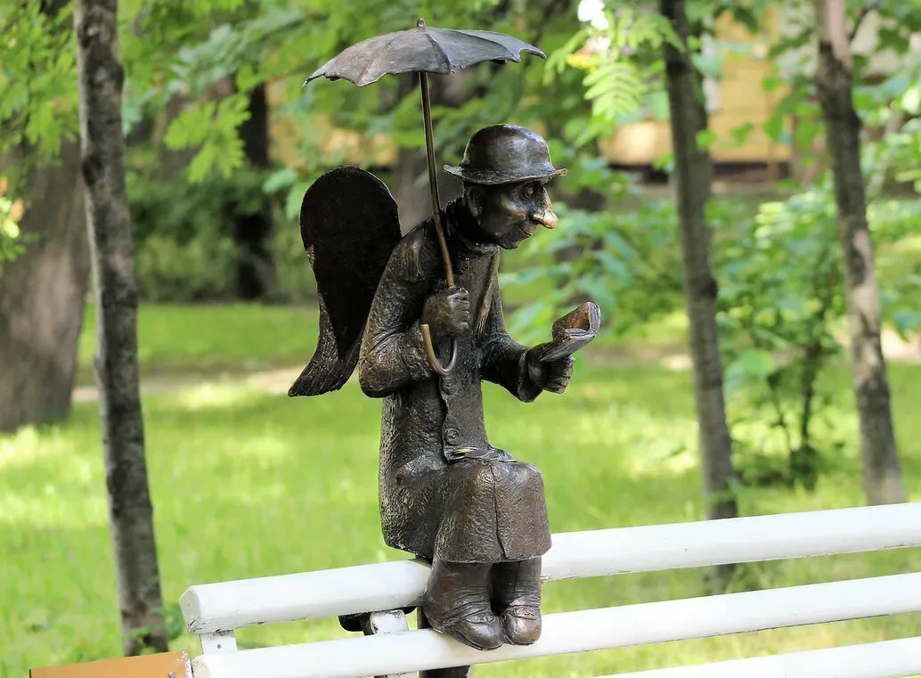 Он был добр ко всем. Мимо его главного персонажа, рожденного воображением, любовью и духом города — читающего ангела в Измайловском саду, — постоянно шли люди. Хотя нет, мимо — неудачное слово. Миновать ангела невозможно. Маленький, застенчивый, в старомодном пальто, скосолапив ноги в стоптанных ботинках, он сидит на спинке скамьи под зонтиком, с книжкой в руках, в окружении столетних деревьев, словно был здесь всегда. Свой, родной, домашний. С таким хорошо гонять чаи и хрустеть сушками.
