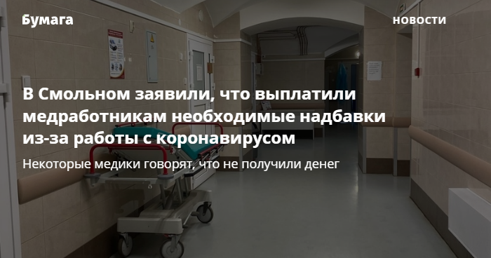 В апреле Смольный утвердил доплаты петербургским врачам, работающим в стационарах с зараженными коронавирусом, в размере 80 тысяч рублей в месяц. Среднему персоналу должны выплачивать по 50 тысяч рублей, а младшему персоналу — 25 тысяч рублей. Врачам скорой помощи пообещали по 50 тысяч рублей в месяц, младшему персоналу и водителям машин — по 25 тысяч рублей.