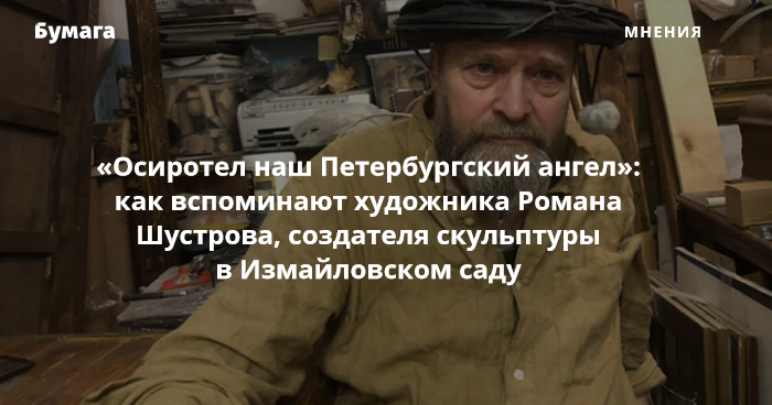 — В Мариинской больнице от двусторонней пневмонии, вызванной COVID-19, скончался художник, скульптор, кукольник Роман Шустров — создатель символа нашего города Петербургского Ангела, присевшего на скамейке под зонтом и с книжкой в Измайловском саду… Об этой бронзовой скульптуре высотой всего в 70 сантиметров, но любимой всем Петербургом, Роман Шустров говорил так: «Она посвящена старикам из моего ленинградского детства. Эти старики, пережив все невзгоды первой половины ХХ века — гражданскую войну, голод, сталинские репрессии, блокаду — смогли сохранить в себе оптимизм».