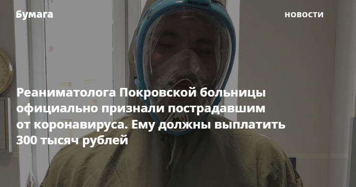 Рабочая комиссия Покровской больницы признала реаниматолога Сергея Саяпина пострадавшим вследствие оказания помощи пациенту с COVID-19. Об этом «Бумаге» сообщил сам Саяпин. По правилам, ему должны выплатить 300 тысяч рублей за заражение коронавирусом на рабочем месте.
