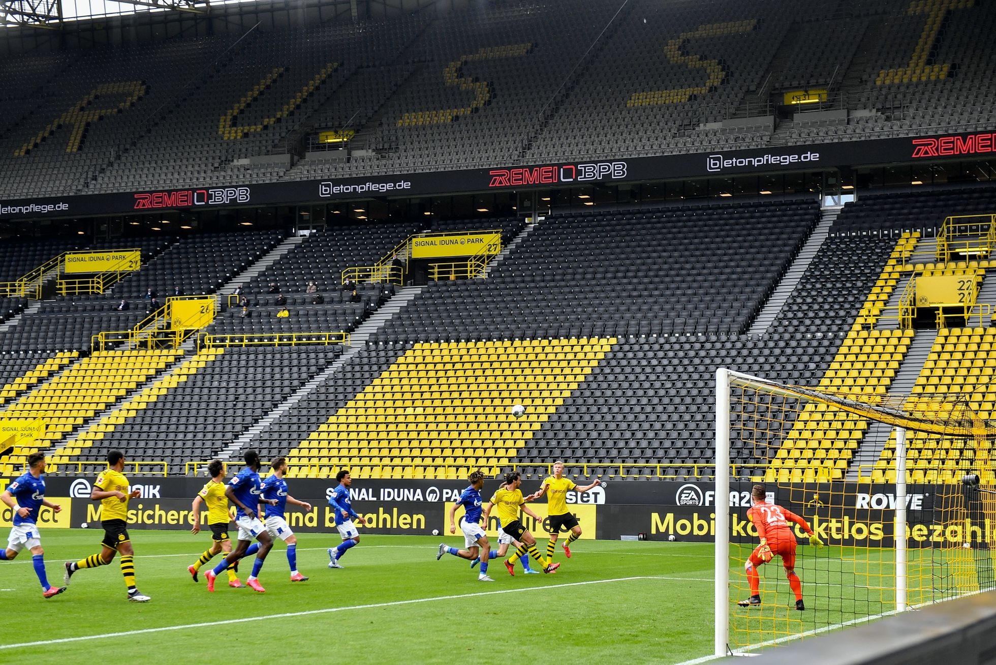 Martin Meissner / AP / Scanpix / LETA С 16 мая возобновлены матчи чемпионата Германии по футболу — Бундеслиги, не проводившиеся более двух месяцев из-за пандемии COVID-19. В первом после перерыва матче встретились дортмундская «Боруссия» и «Шальке 04». Из-за коронавируса матчи Бундеслиги пока проходят без зрителей.