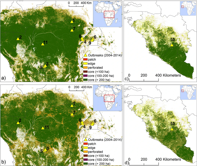 Жёлтыми треугольниками на карте обозначены первые выявленные случаи заражения человека вирусом Эбола, после которых начинались вспышки вируса с 2004 по 2014 годы. Эти первые случаи вызваны передачей вируса от животных человеку, и большинство из них произошло в зонах растущей фрагментации леса. Источник: Rulli et al. (2017).