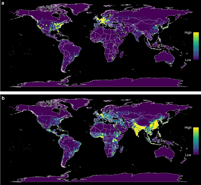Предсказанные риски просчитаны (а) без поправки на развитые системы отслеживания заражений; (b) с поправкой на такие системы. Поскольку модель обучена на данных об уже выявленных инфекциях, авторы вводят поправку, с помощью которой сглаживается эффект хорошо развитых исследовательских структур и систем выявления заболеваний. Заметно, что поправка смещает высокие относительные риски от крайне урбанизированных зон Европы и Северной Америки, где выявление инфекций хорошо налажено, к тропическим зонам Азии и Африки.