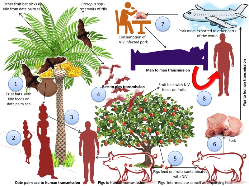 На рисунке отражены ранее упомянутые пути передачи вируса Нипах: